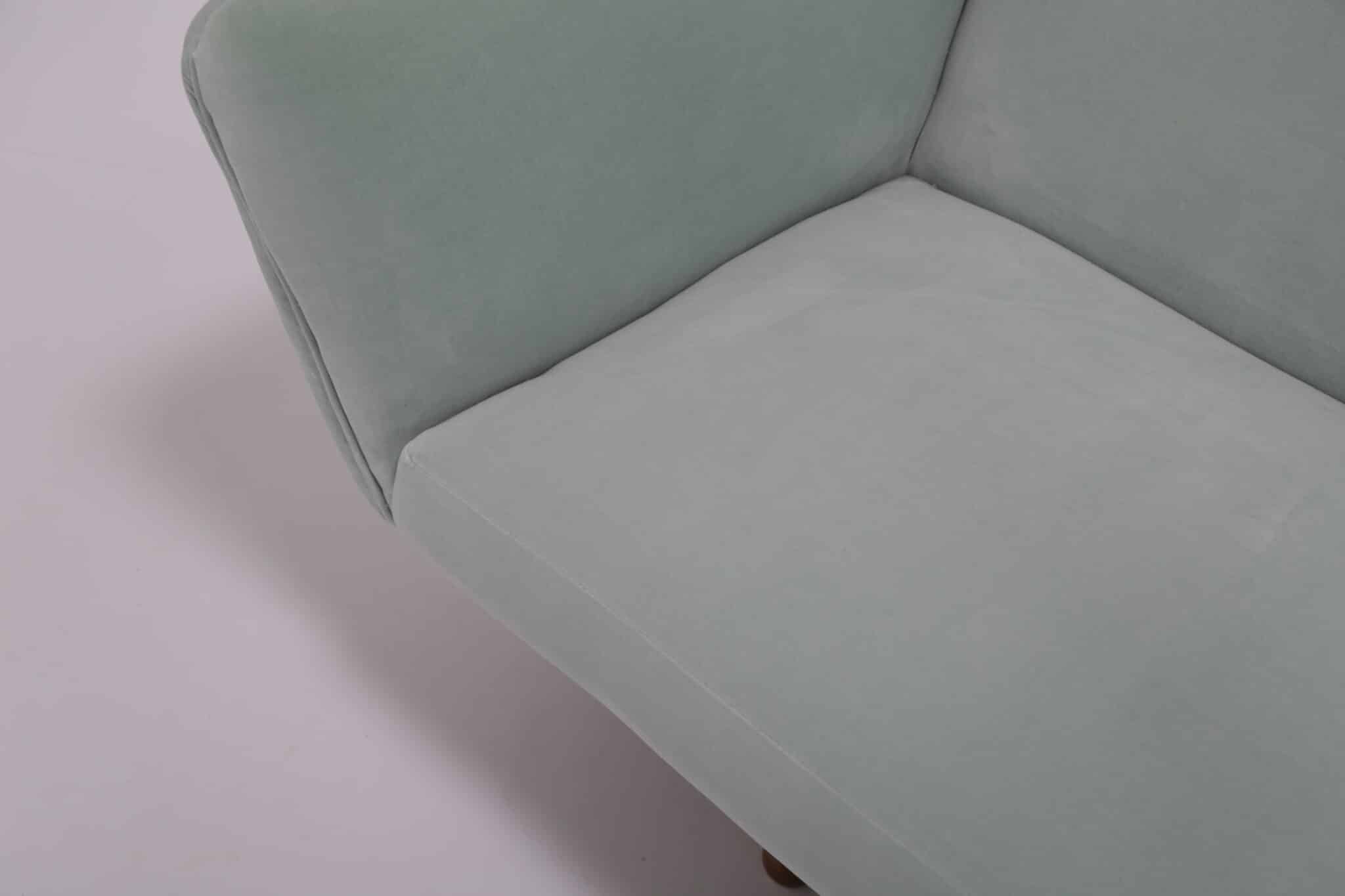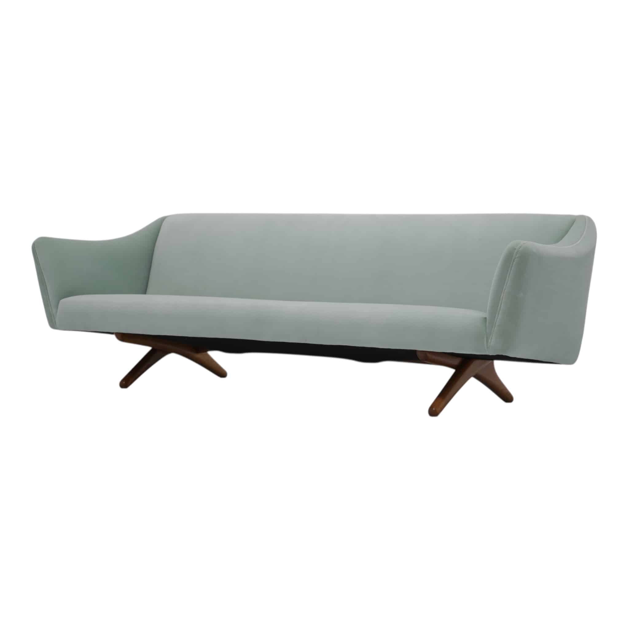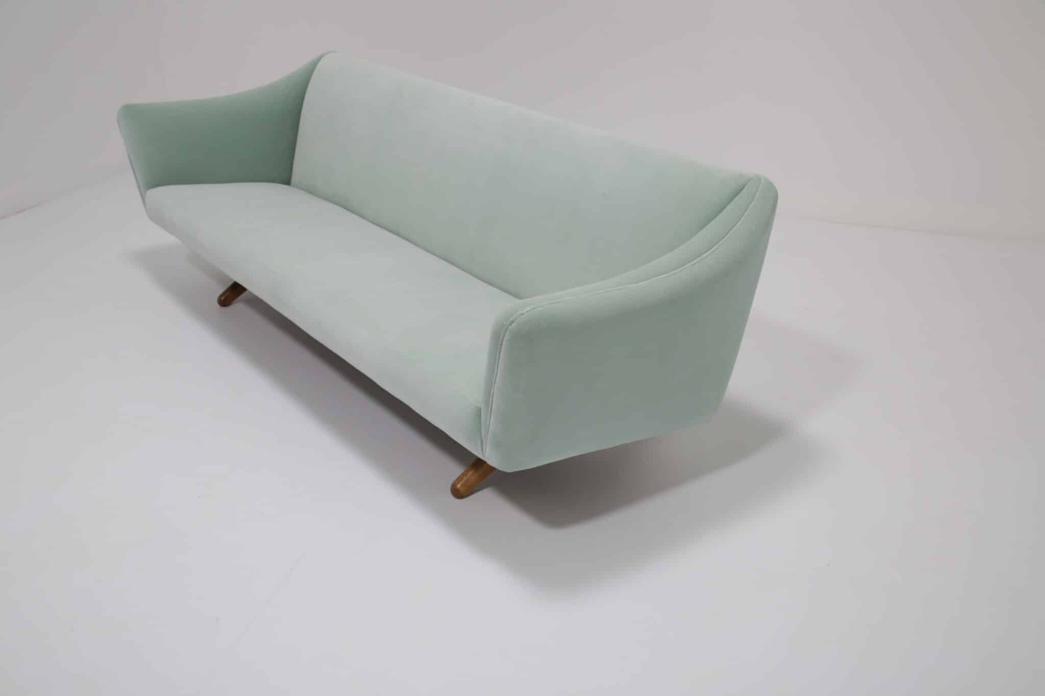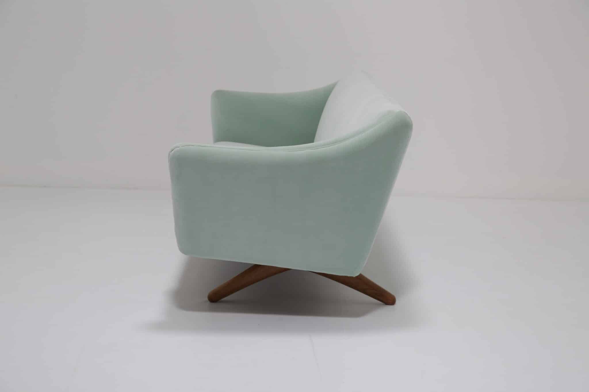 The piece was designed by Illum Wikkelso who is a firm favourite designer of ours. It’s a very comfortable sofa to sit in and one could definitely have a quick nap on it too (with the aid of a few cushions as a pillow). The velvet is a high quality cotton velvet. The sofa will comfortable seat 3. I hope this sofa looks as well in photos as it does in real life.