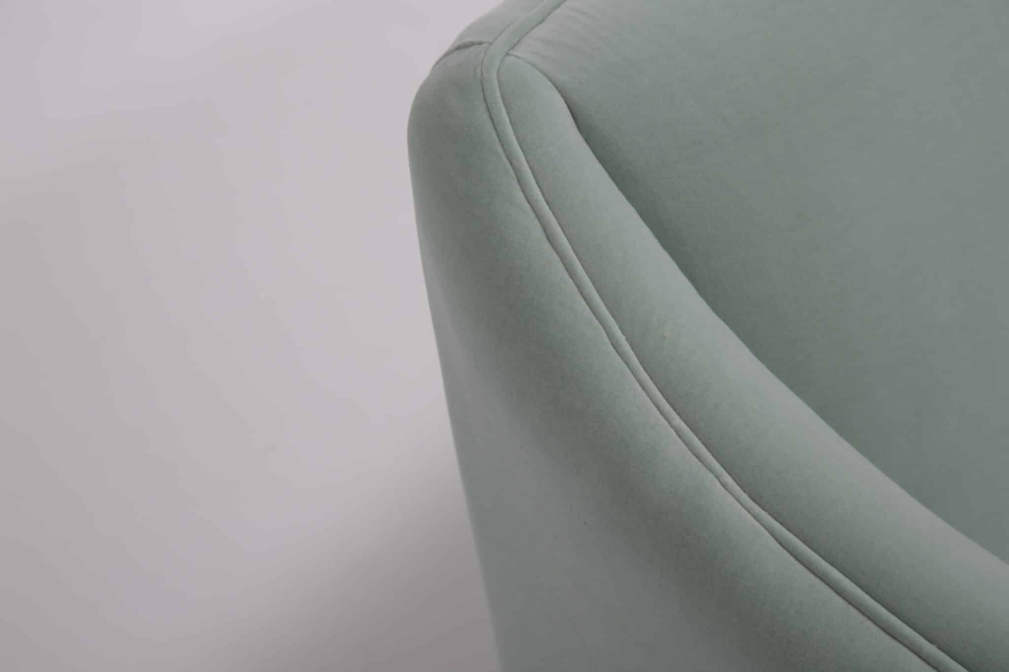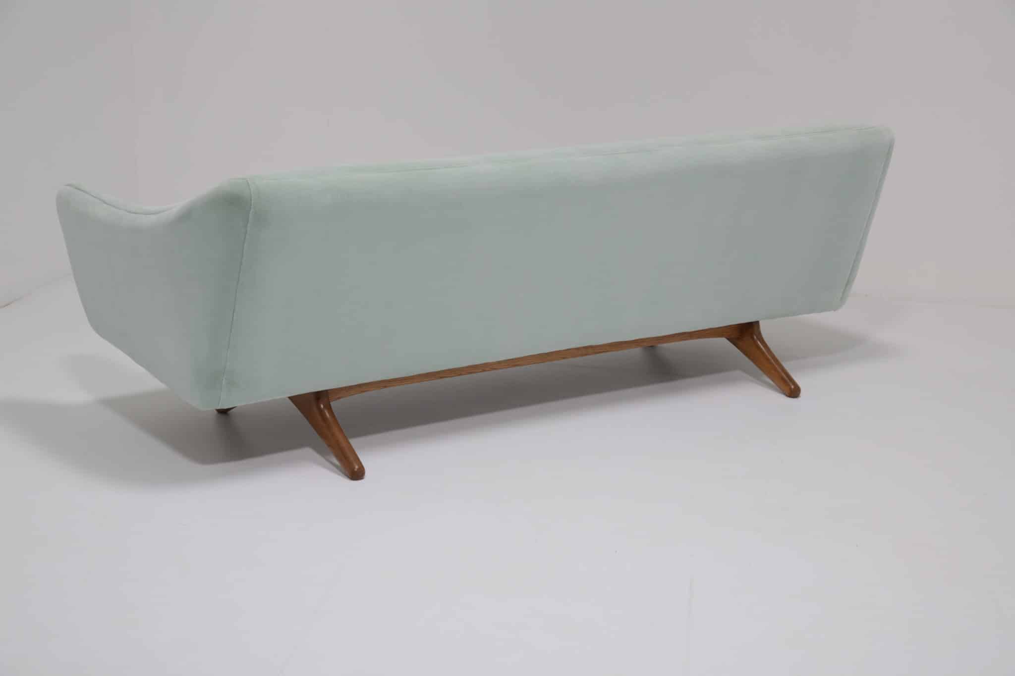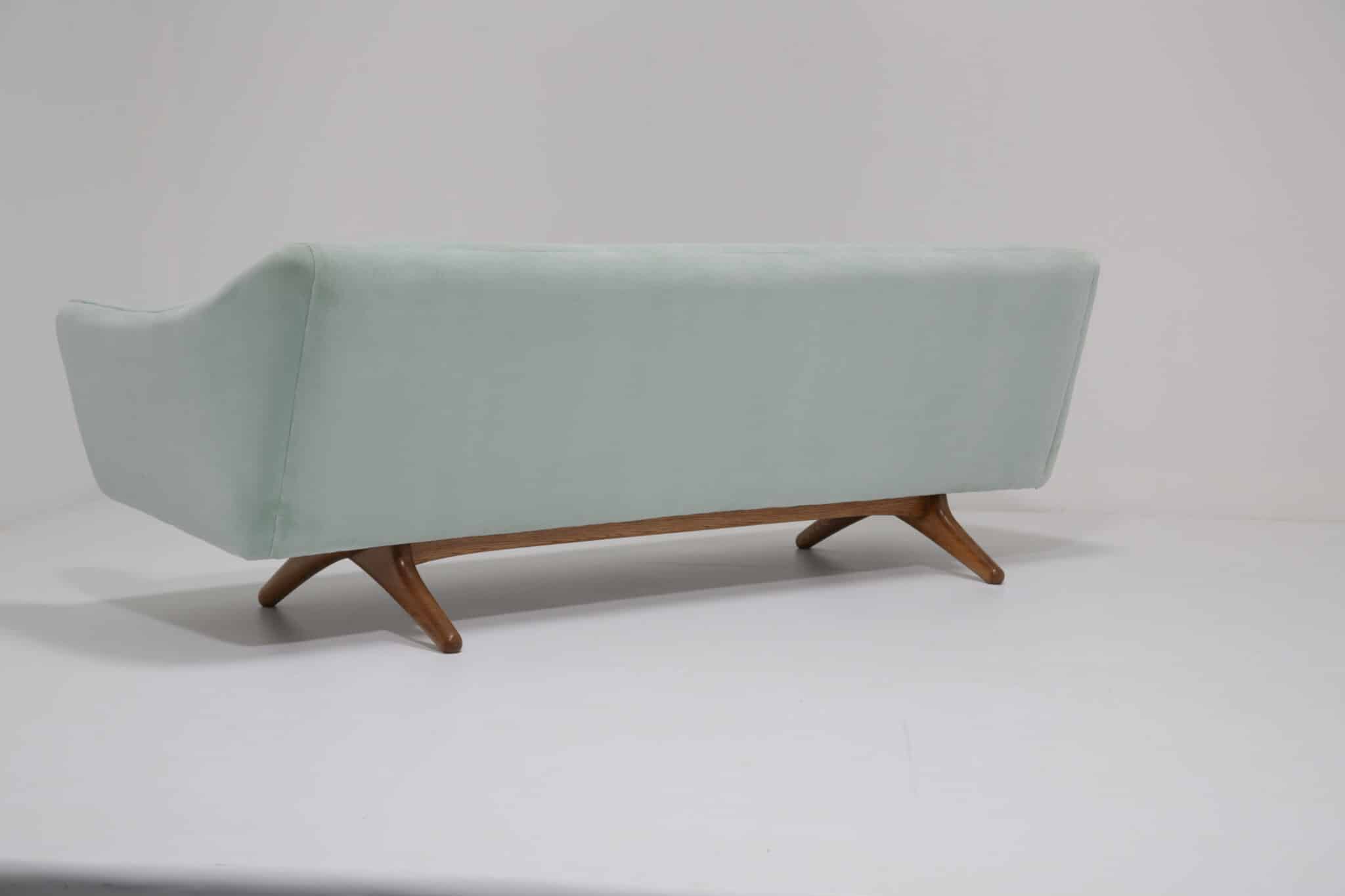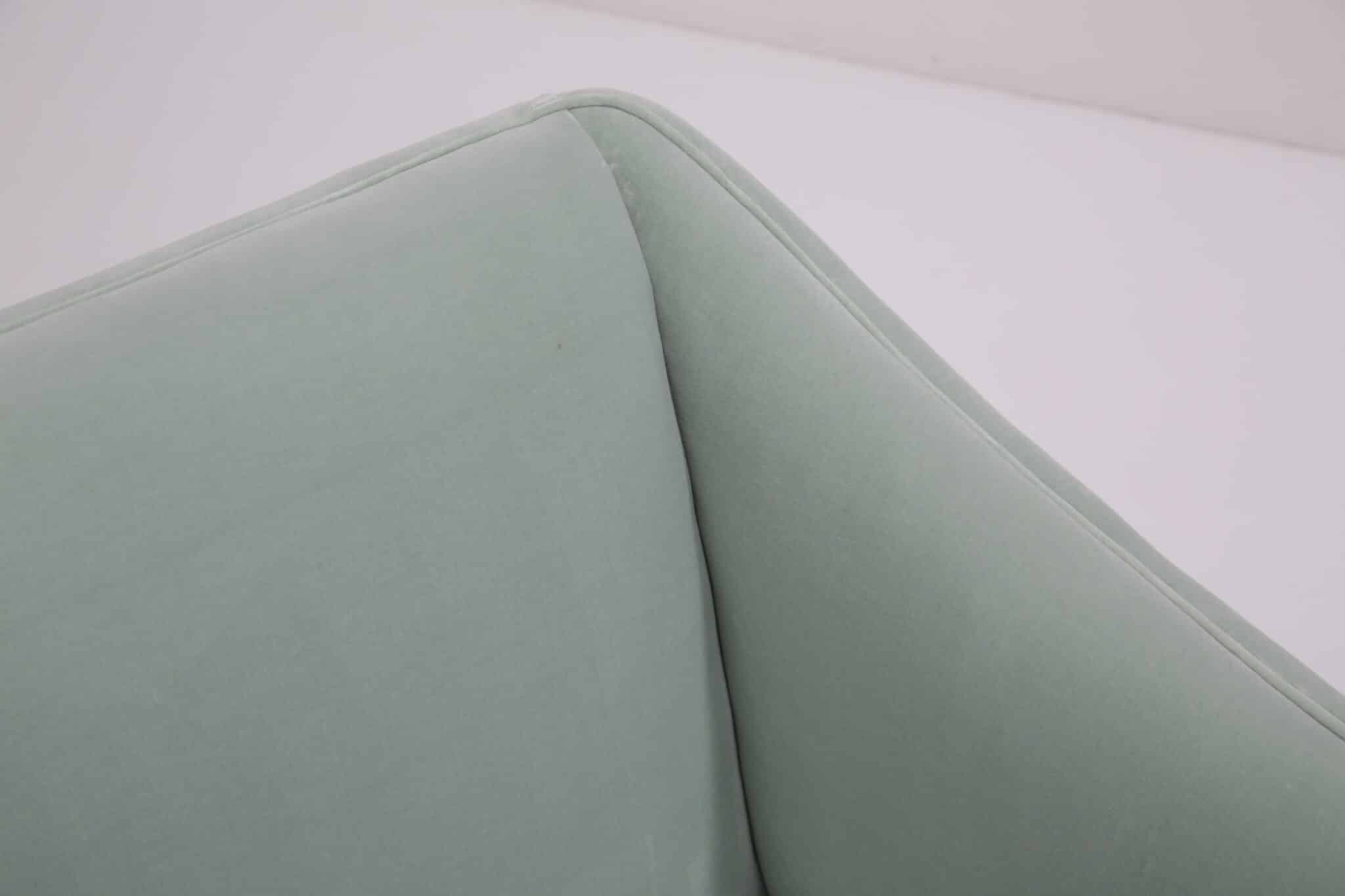 When I bought this Illum Wikkelso ML90 Sofa it was black leather and had a ton of cat claw marks all over the sides. I personally love recovering Danish leather sofas in modern bright coloured velvet fabrics so I had a few meters of this powder blue cotton velvet that I felt would make a dowdy enough black leather covered piece sing and for me the results are exactly what I had hoped. For me this sofa now sings !! the shapely legs and the curved arms etc all now have their own space and then come together in beautiful unison to give this piece real presence.
