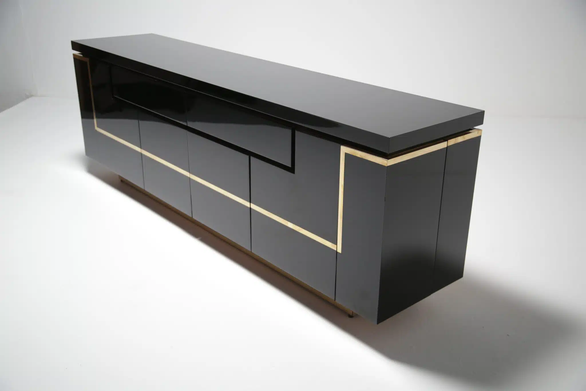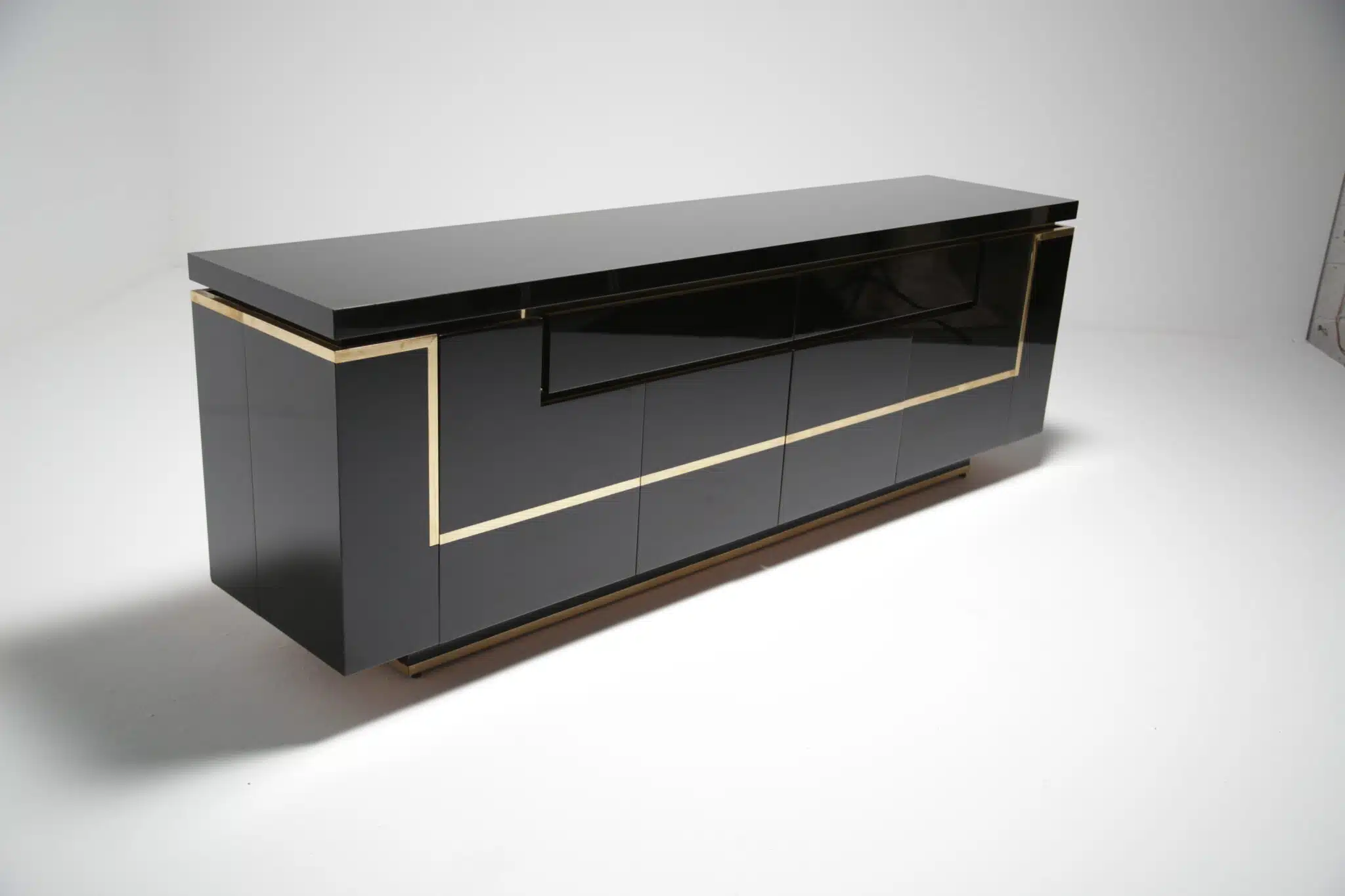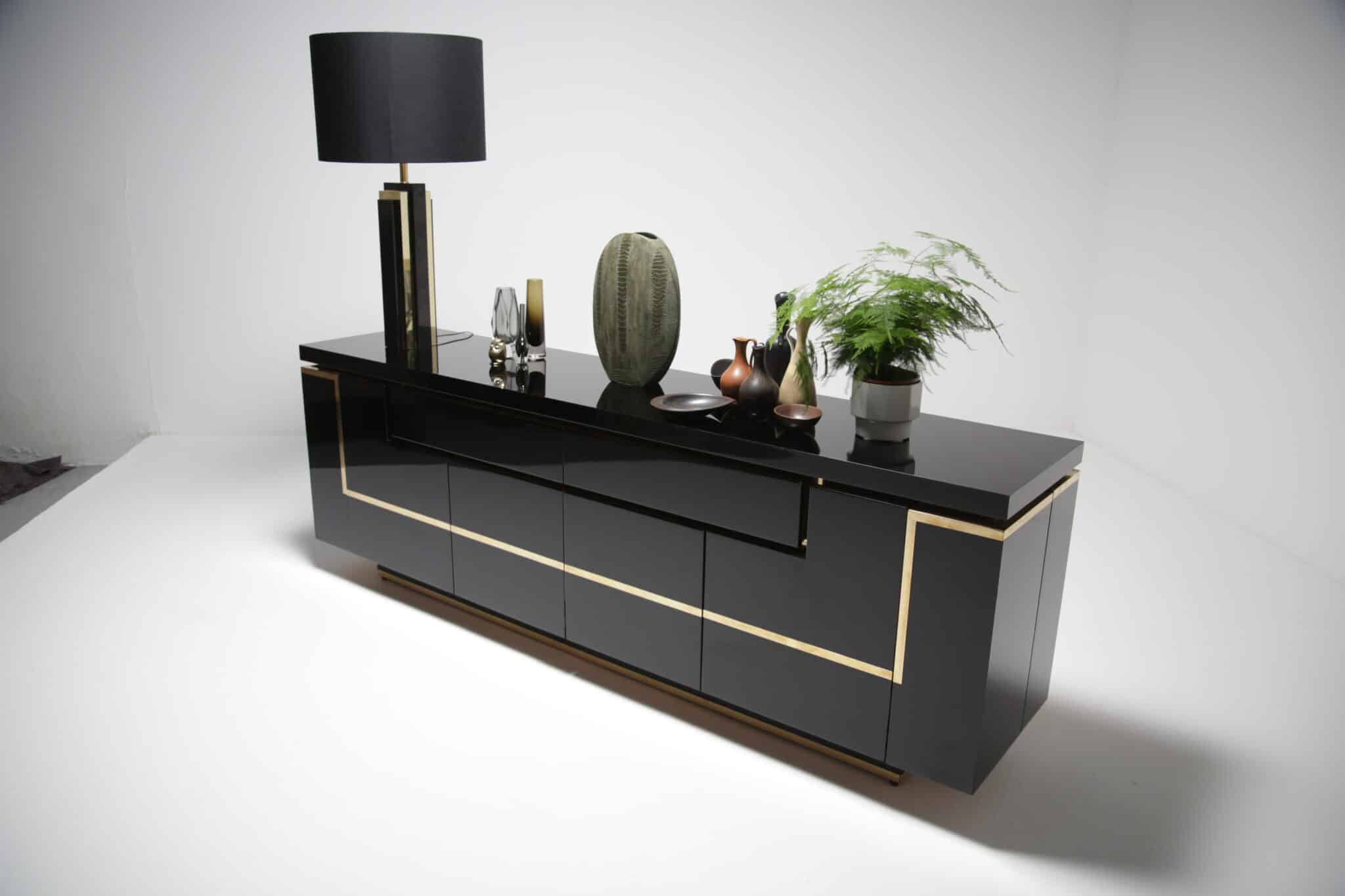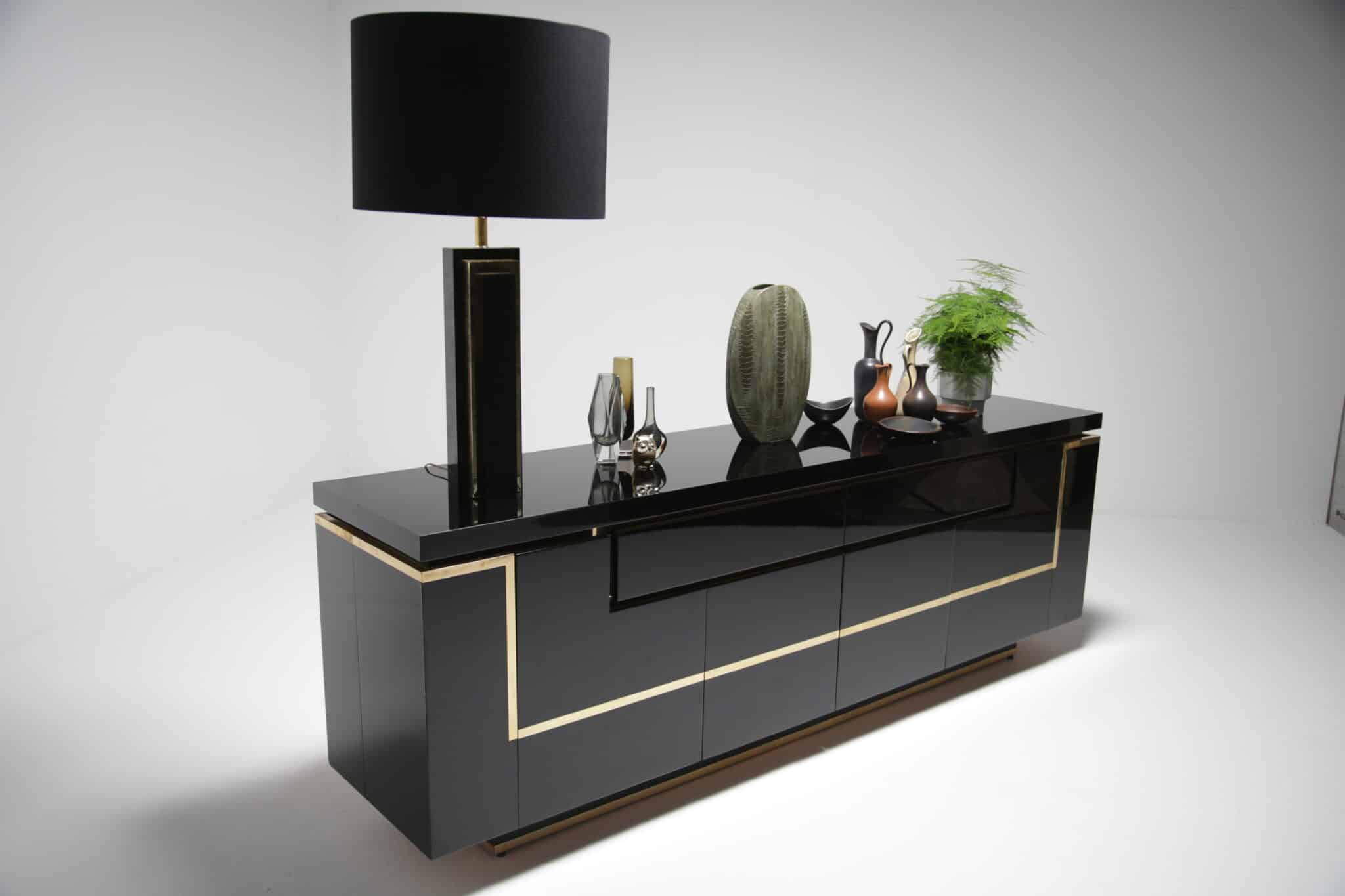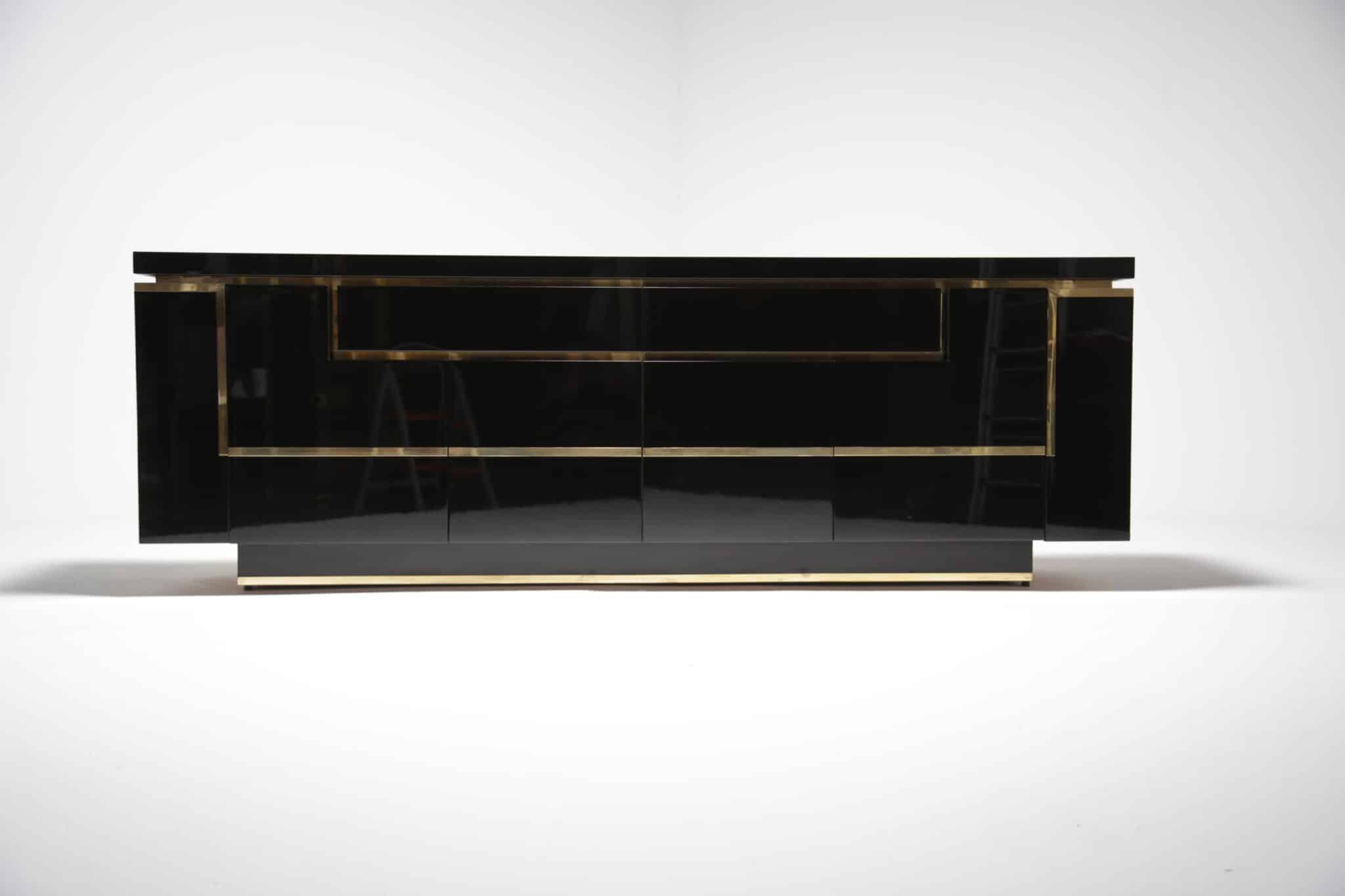 A Jean Claude Mahey sideboard made using a piano finish black gloss paint and brass accent pieces. Possibly one of the nicest looking sideboards ever made and firm favourite of ours. This piece is now sold.