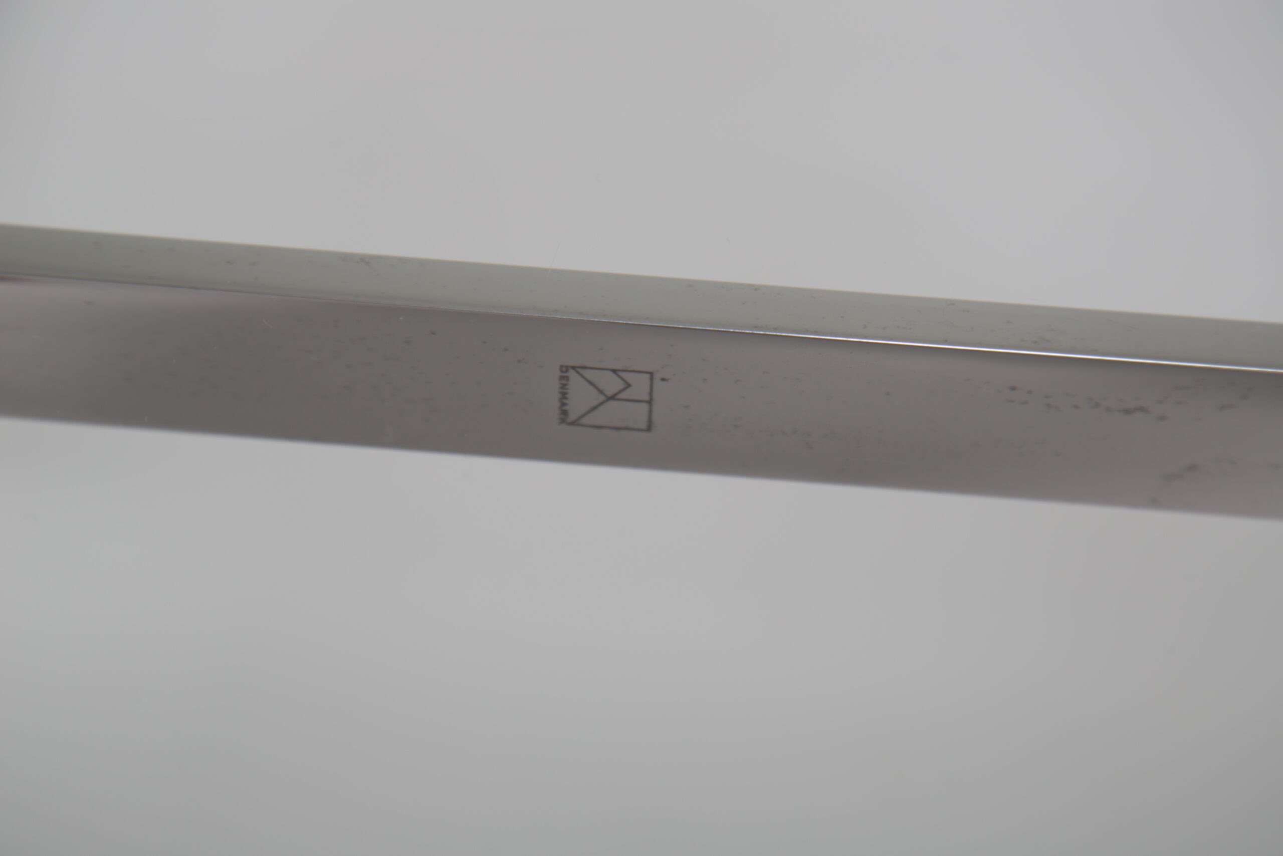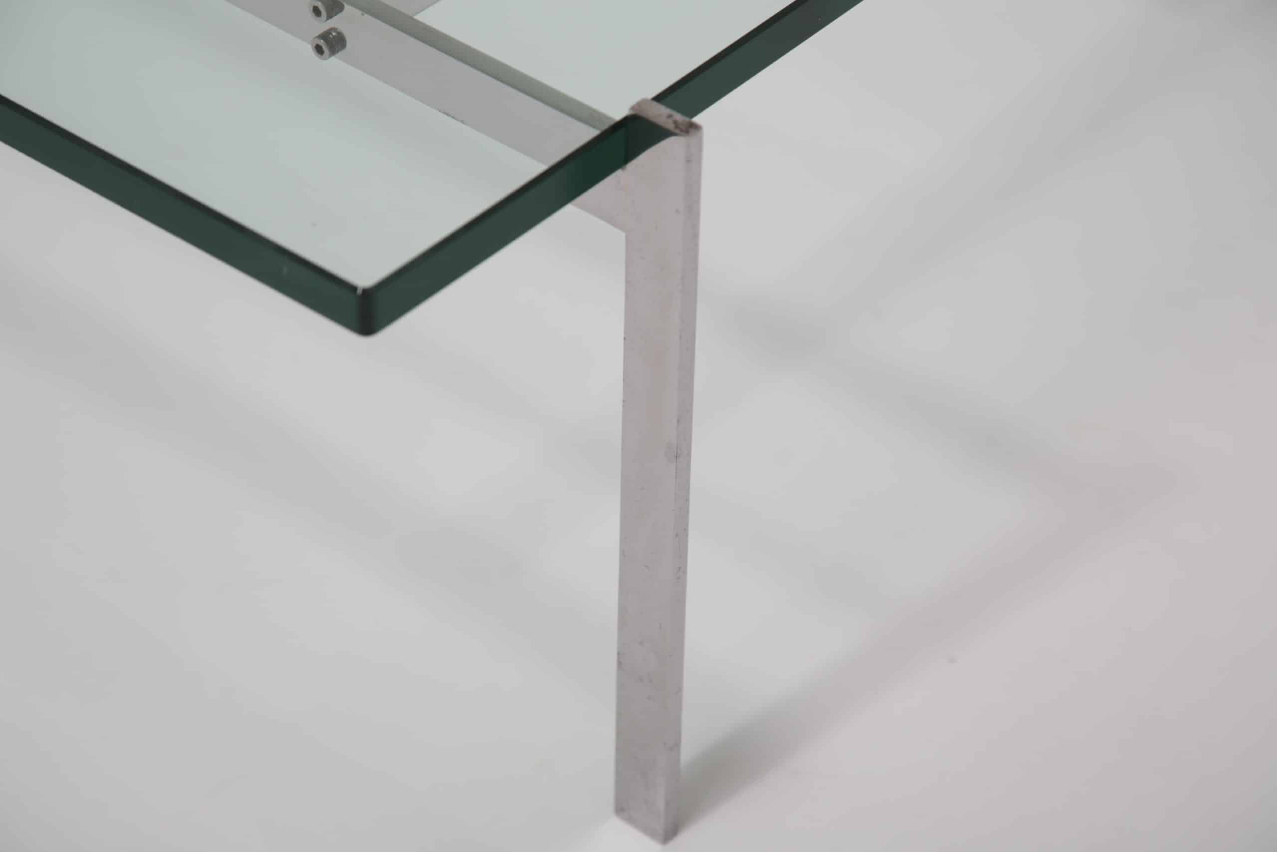 The Poul Kjaerholm PK61 Coffee Table, designed in 1956, is a standout piece of modernist furniture. It highlights Kjærholm’s innovative use of industrial materials and his dedication to minimalist design. This rare version, stamped with the distinctive EKC mark, was originally produced by E. Kold Christensen before Fritz Hansen took over production in 1982. The table features a sleek, matte chrome steel base with a refined patina, giving it a timeless appeal. Its thick glass top has been replaced and remains in pristine condition, free from chips or scratches.